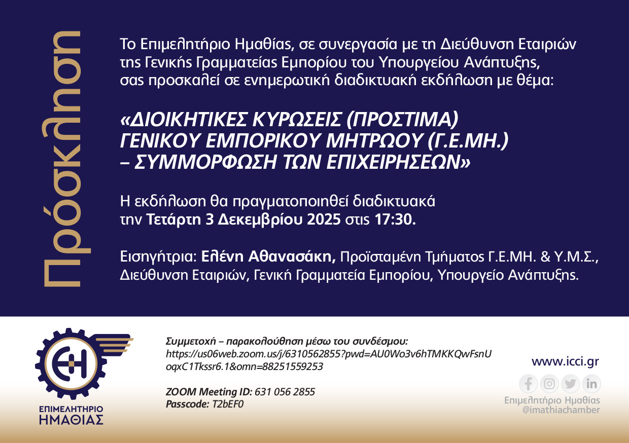 Το Επιμελητήριο Ημαθίας, σε συνεργασία με τη Διεύθυνση Εταιριών της Γενικής Γραμματείας Εμπορίου του Υπουργείου Ανάπτυξης, σας προσκαλεί σε ενημερωτική διαδικτυακή εκδήλωση με θέμα: «ΔΙΟΙΚΗΤΙΚΕΣ ΚΥΡΩΣΕΙΣ (ΠΡΟΣΤΙΜΑ) ΓΕΝΙΚΟΥ ΕΜΠΟΡΙΚΟΥ ΜΗΤΡΩΟΥ (Γ.Ε.ΜΗ.) – ΣΥΜΜΟΡΦΩΣΗ ΤΩΝ ΕΠΙΧΕΙΡΗΣΕΩΝ».